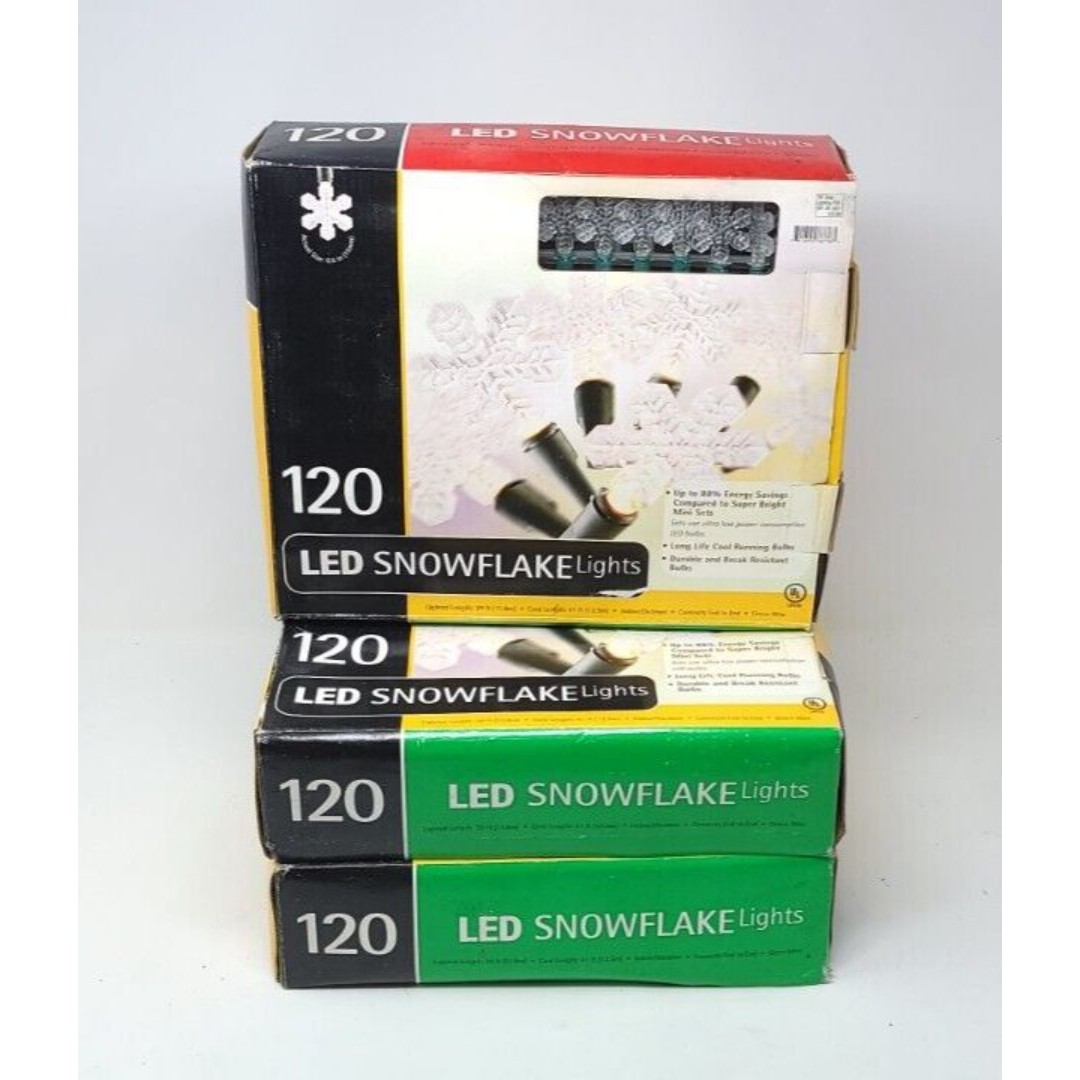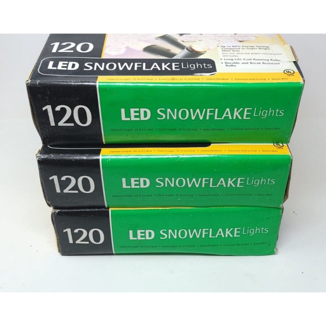 You get all 3 boxes of snowflake string lights shown. Each box is about 40 feet long and eachs tring has 120 snowflake led lights. So in total about 120 feet of lights with 360 total snowflakes. See photos. Lights are new but boxes show a little wear from storage.