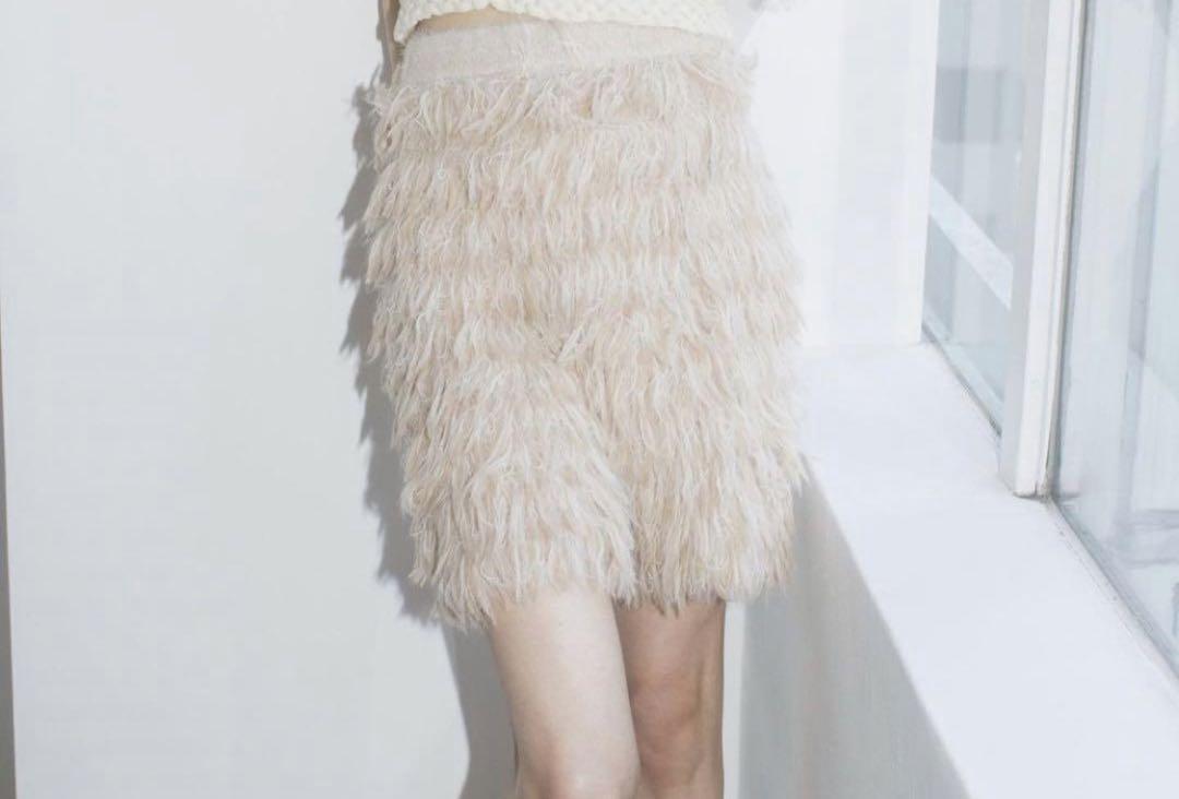 A knit bralette made with a combination of feather yarn, which resembles feathers, and mohair, fringed with a crochet hook.