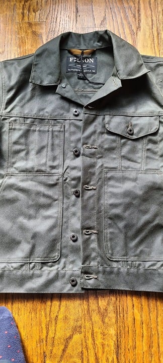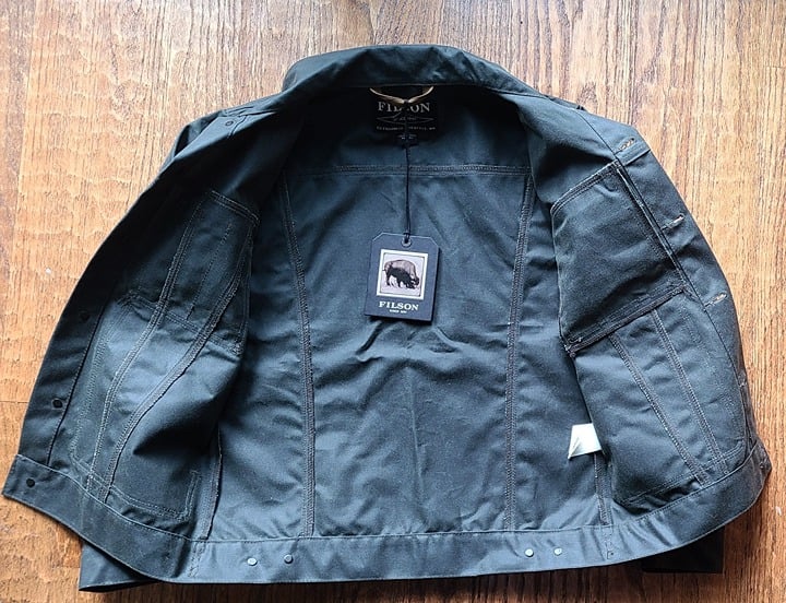Filson ran limited production of this tin cruiser jacket and all sizes sold out really quickly. This is a waxed cotton jacket which is very heavy fabric making the garment both abrasion and water resistant.