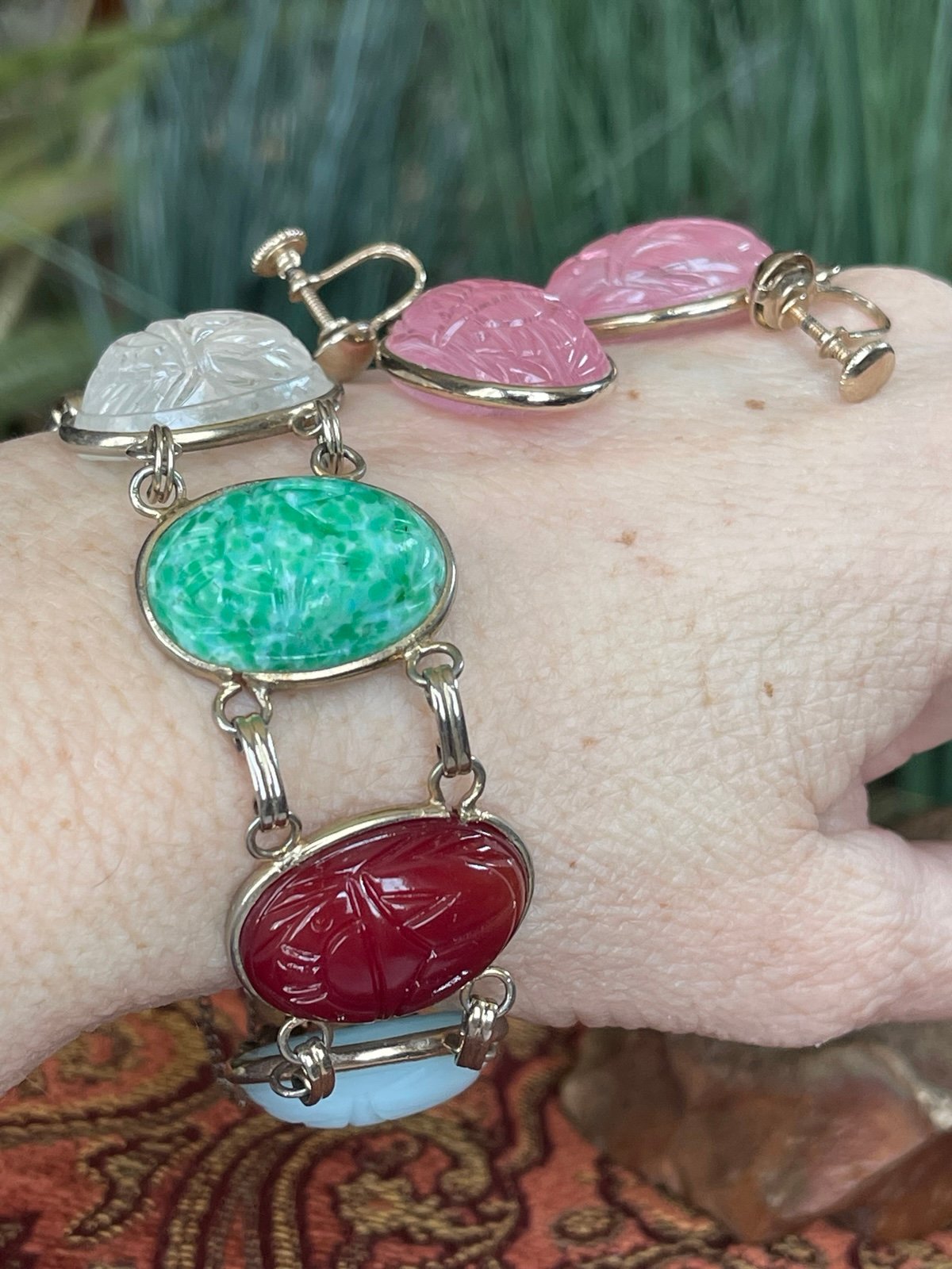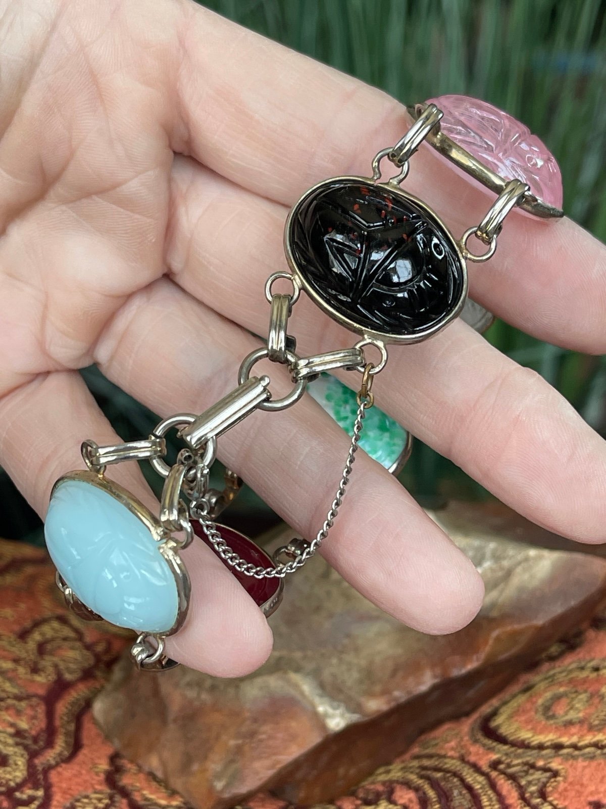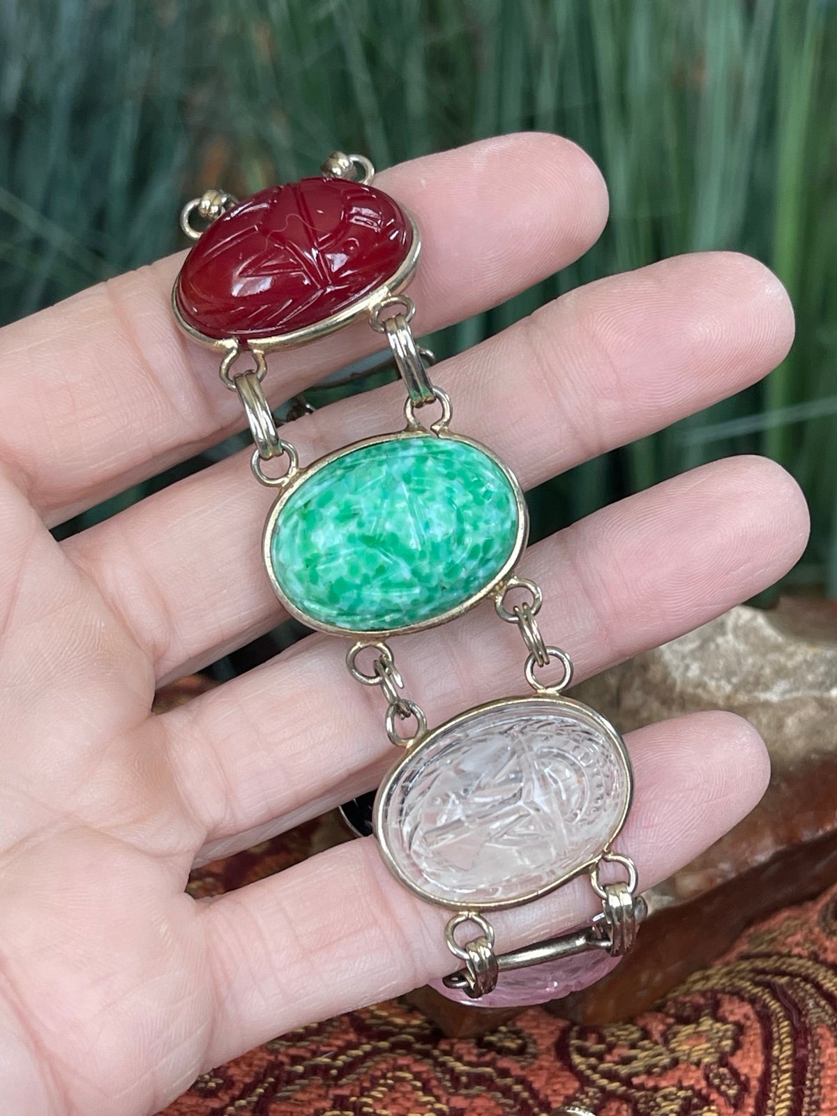 Vintage wide double linked goldtone bracelet with glass scarab cabochons in Openback setting. 1” wide and 8” long. 48 grams. Unsigned. Quality made.