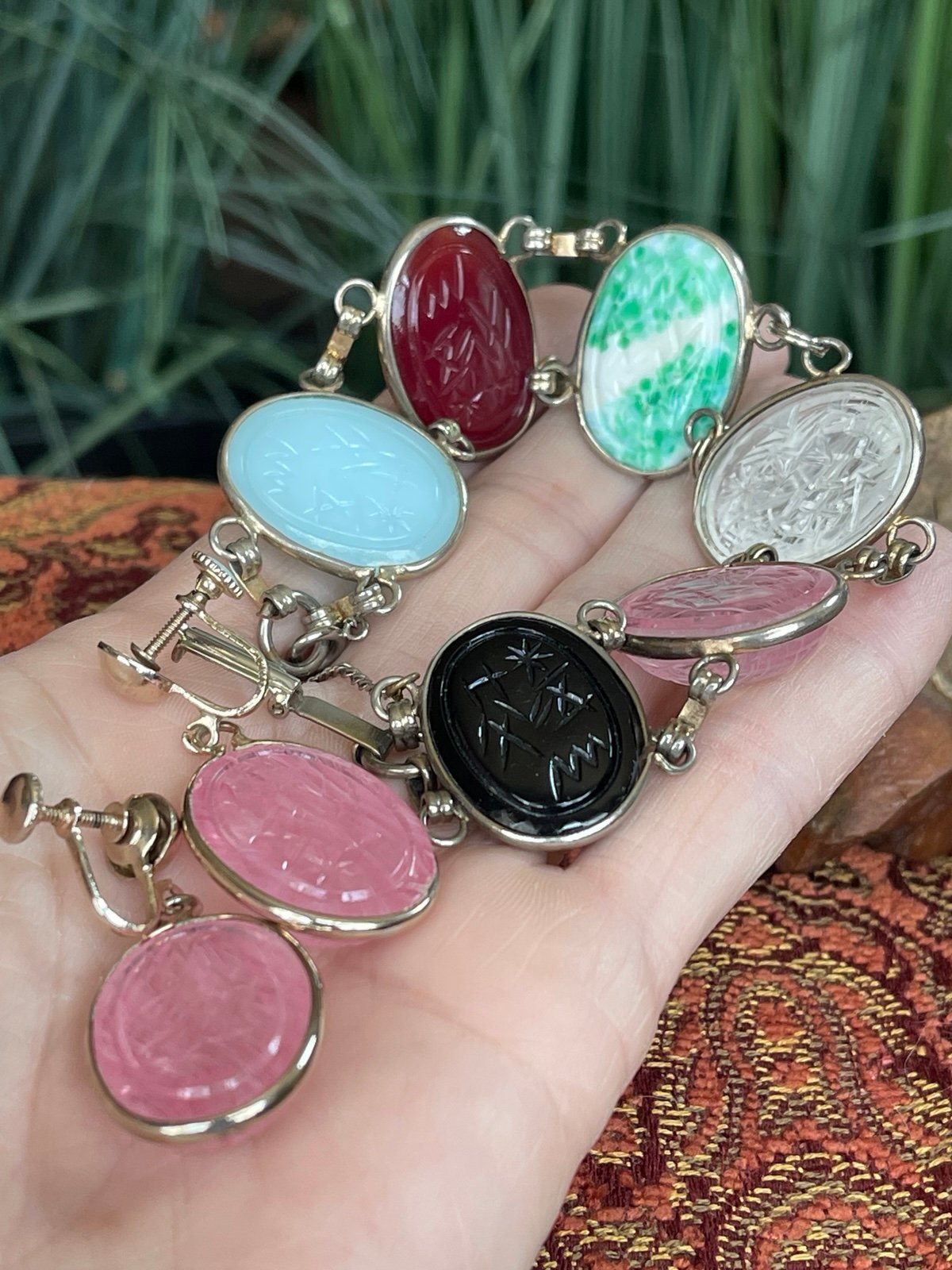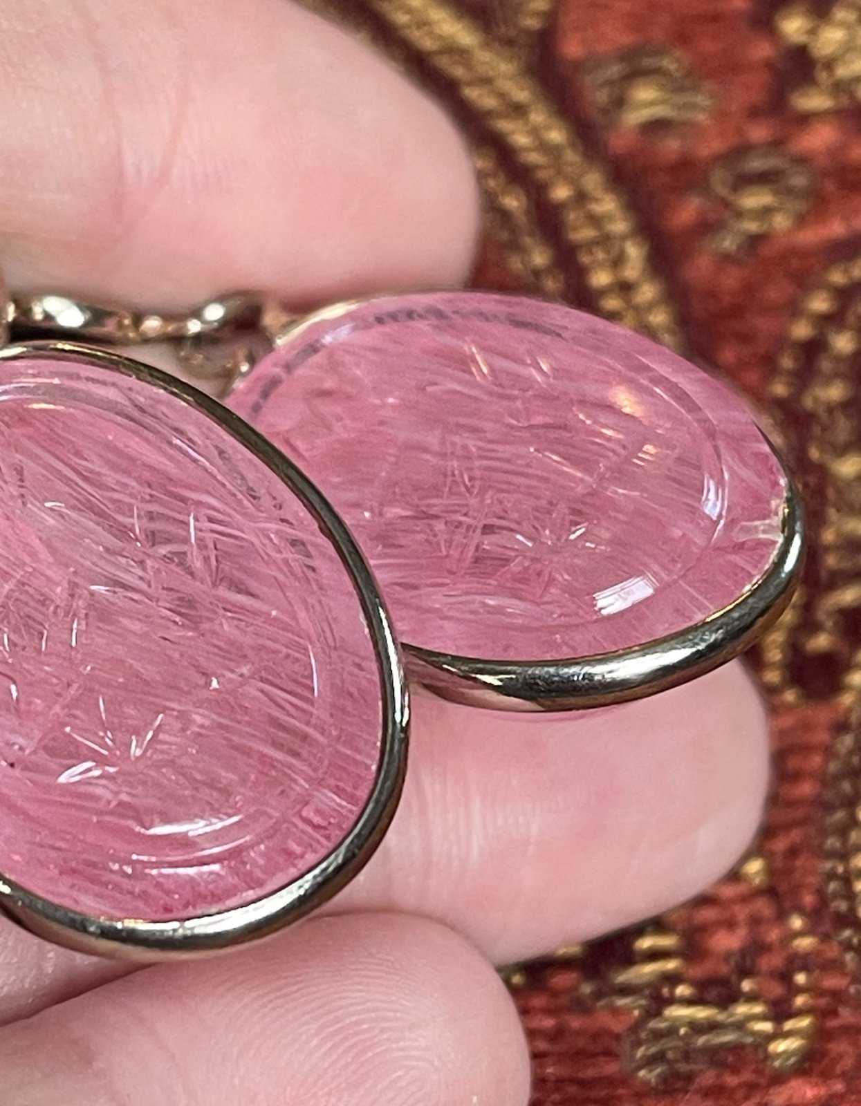 Matching pink scarab screwback earrings measure 1.5” long x .75” wide. One .13” chip to back of pink scarab. Otherwise good vintage condition.